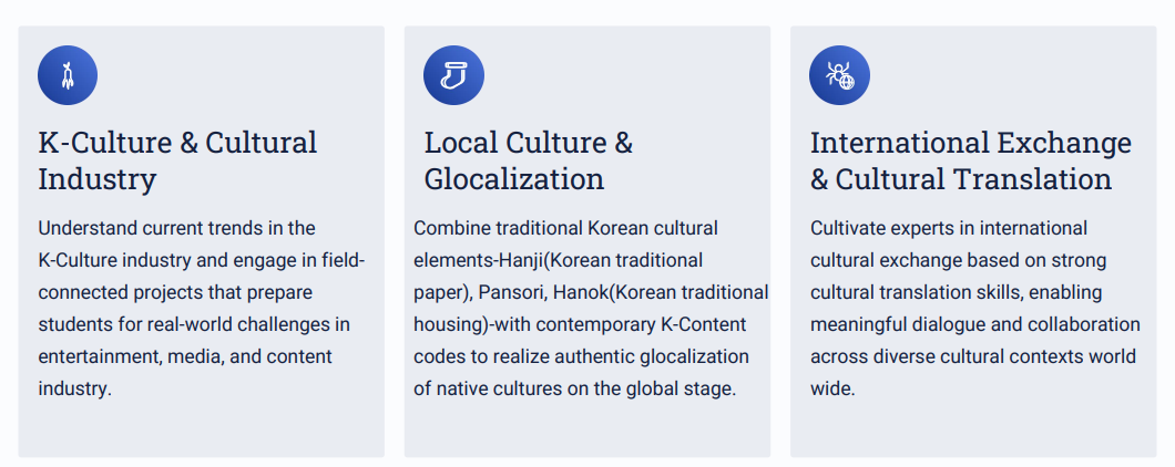 Our department aims to cultivate convergence-oriented talents who possess a profound understanding of K-Culture and can independently plan and produce cultural content on the global cultural industry stage. We ground our education in humanistic reflection and critical thinking, guiding students to analyze the structure and meaning of mass cultural content while simultaneously gaining practical competence in understanding industry trends. Furthermore, we strive to realize a talent profile that achieves diversity and sustainability in cultural production by linking local cultural resources with the global content market.